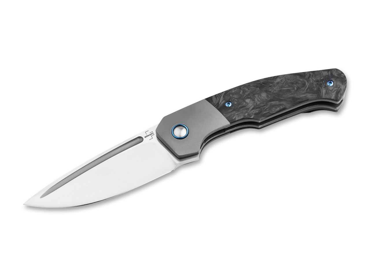 Zeitlose Ästhetik aus jeder Perspektive ? für ein zeitgemäßes Savoir-vivre in jedem Moment. Form und Vollendung als Ausdruck von Können, Güte und Begierde. Das handverlesene Böker Plus Collection 2025 gibt der Exklusivität das Besondere; mit einer streng limitierten Auflage von 500 Exemplaren weltweit. Thierry Savidan hat ein Auge für das Außergewöhnliche. Als gelernter Optiker und messeraffiner Autodidakt erfüllt der aus Frankreich stammende Messermacher jedes Detail mit einzigartiger Magie. Seine Vorliebe aus modernen Materialien in Verbindung mit klassischen Elementen kommt beim Sammlermesser vollumfänglich zum Tragen. Ausgestattet mit einer kugelgelagerten Droppoint-Klinge aus pulvermetallurgischem CPM MagnaCut (62-63 HRC) im Satin-Finish nimmt das Taschenmesser jeder Schneidarbeit den Anspruch. Geöffnet wird der Folder wahlweise per Flipper oder ausgeprägten Nagelhau, während der Linerlock aus Titan kompromisslos verriegelt. In klassischem Aufbau ist der Griff gefertigt, der mit Titanbacken und Griffschalen aus Marble Carbon an traditionelle Taschenmesser erinnert und eine klangvolle Symphonie bildet. Dazu passend fügen sich der imposante Backspacer mit rutschfesten Jimpings sowie der 3D-gefräste Clip (Tip-Up/r), beide ebenfalls aus Titan und mit einem gedeckten Bead Blast-Finish veredelt, nahtlos ins neo-klassischeGesamtbild ein. Blau anodisierte Elemente wie der Mokuti-Ring entlang der Klingenachsschraube sowie die diskreten Griffschrauben akzentuieren das Sammlerstück in besonderer Weise. Die Auslieferung des Jahresmessers erfolgt mit einem hochwertigen Filz-Etui zur Aufbewahrung und Echtheitszertifikat. Böker Plus Collection 2025 ? Un coup de foudre!